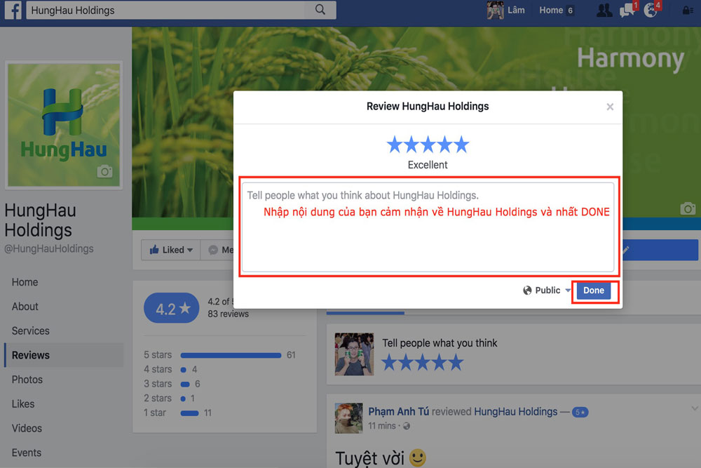 Hướng dẫn cách đánh giá xếp hạng 5 sao cho Fanpage HungHau Holdings