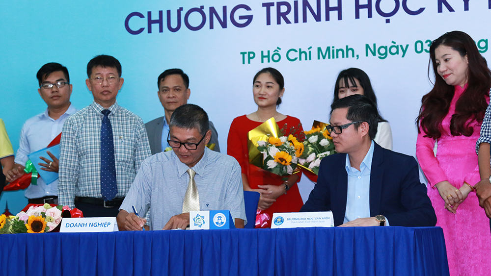 TS. Lê Sĩ Hải – GĐ Điều hành Trường Đại học Văn Hiến ký kết cùng đại diện Doanh nghiệp trước chứng kiến của Giảng viên và Sinh viên