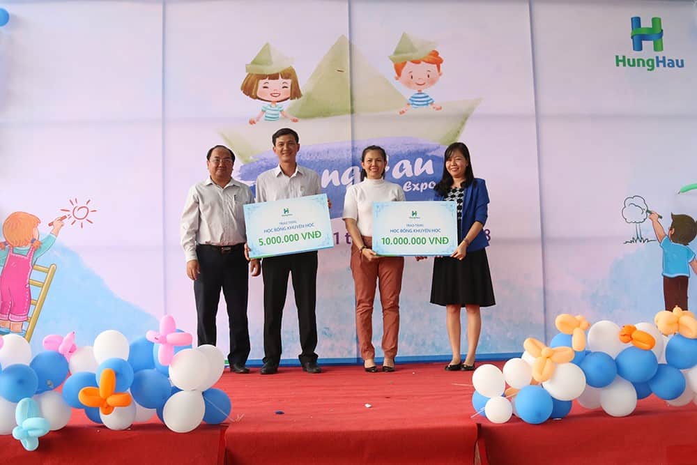 Ban lãnh đạo HungHau Holdings trao tặng bằng khen cho 10 em có thành tích học tập xuất sắc trong năm học vừa qua.