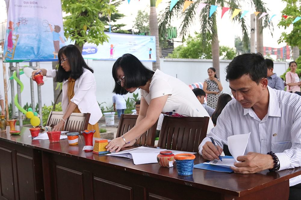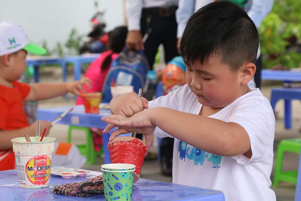 Đặc biệt, các em được thỏa sức thể hiện những sáng tạo của riêng bản thân mình trong các tác phẩm do chính tay làm nên qua các hình thức: Vẽ tranh, thêu tranh/ xé giấy dán tranh, tô màu mỹ thuật trên gốm sứ, … với chủ đề “Hạnh phúc cho em”.