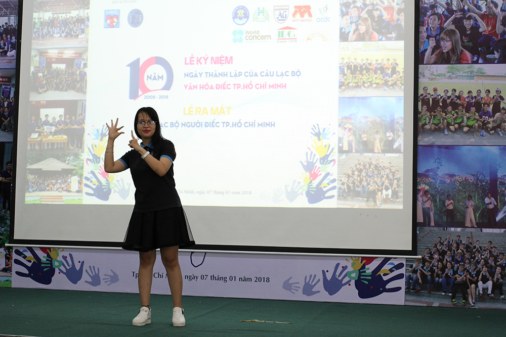 Bạn Lê Minh Tú (Sinh viên năm 1 ngành Tâm lý học Trường Đại học Văn Hiến) – Chủ tịch CLB Văn hóa Điếc Tp. Hồ Chí Minh phát biểu những thành tựu và quá trình hoạt động, phát triển trong 10 năm qua của CLB.