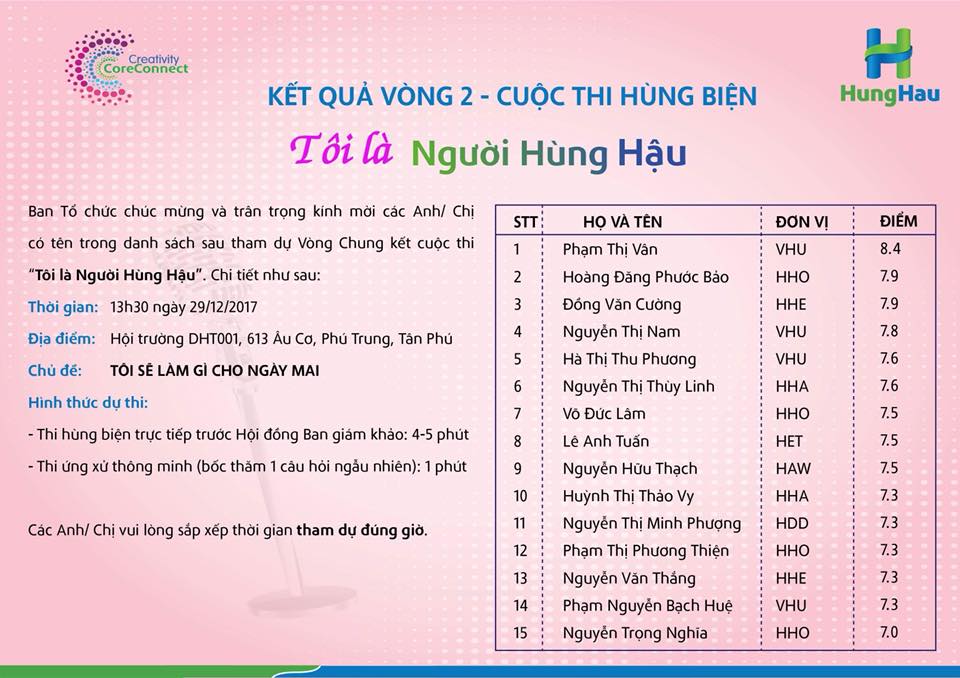 Cuộc thi hùng biện “Tôi là người Hùng Hậu” do HungHau Holdings tổ chức dành cho các GV-CBNV thuộc HungHau Holdings. Với mong muốn lắng nghe các quan điểm, ý tưởng, ý kiến đóng góp của từng GV-CBNV cho sự phát triển chung của Hùng Hậu, đồng thời tạo ra sân chơi bổ ích, thiết thực trên toàn Holdings. Trải qua 2 vòng thi: vòng sơ khảo với chủ đề “Nếu tôi là Sales của Hùng Hậu” và vòng thi số 2 cuộc thi hùng biện đã lộ diện 15 thi sinh xuất sắc nhất tiến vào vòng chung kết.