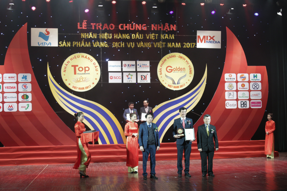 Ông Võ Minh Khang – Giám đốc Điều hành Sản phẩm đại diện HungHau Holdings nhận giải thưởng Top 50 “Nhãn hiệu hàng đầu – Sản phẩm vàng – Dịch vụ vàng Việt Nam 2017”.