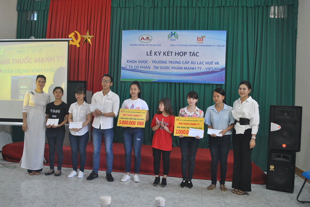 Đây là một trong những chương trình hợp tác thiết thực nhằm đảm bảo việc làm cho học viên sau khi tốt nghiệp ngành Dược tại trường có công việc ổn định tại Công ty CP Thương mại Dược phẩm Mạnh Tý – Việt Mỹ, đồng thời Trường Trung cấp Âu Lạc – Huế cũng cam kết sẽ nâng cao chất lượng đào tạo của học viên đang theo học các ngành chăm sóc sức khỏe tại trường: Dược sỹ, Y sỹ, Điều dưỡng, Kỹ thuật xét nghiệm,… nhằm đáp ứng đầy đủ nhu cầu nguồn lao động chất lượng cao của phía đối tác cũng như ngoài xã hội. Tại lễ ký kết, Công ty CP Thương mại Dược phẩm Mạnh Tý – Việt Mỹ cũng trao nhiều phần học bổng dành cho các học viên có thành tích học tập tốt tại Trường, nhằm khuyến kích cổ vũ học viên phấn đấu học tập và rèn luyện tốt.
