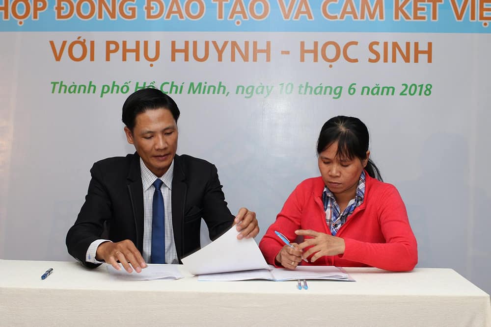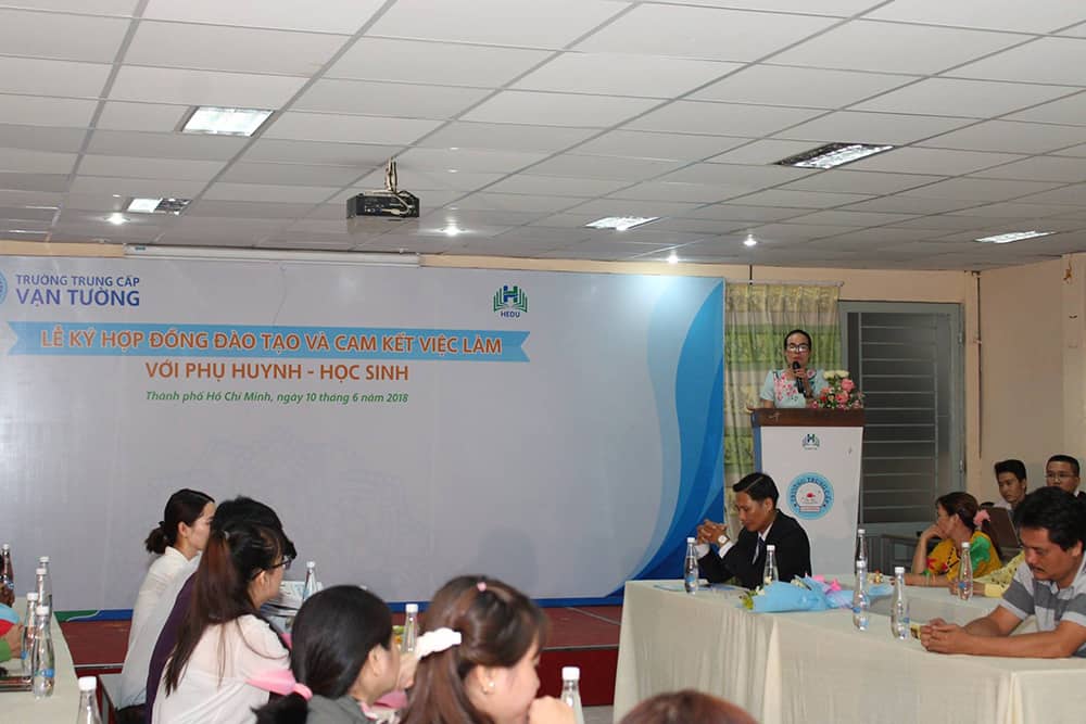 Buổi Lễ “Ký kết hợp đồng đào tạo và cam kết việc làm với phụ huynh – học sinh” có sự tham dự của Ông Lê Anh Tuấn – Hiệu trưởng Trường Trung cấp Vạn Tường, đại diện Quý doanh nghiệp và đông đảo Quý phụ huynh – học sinh trúng tuyển đợt 1/2018 cùng tham dự. Thông qua buổi lễ ký kết nhà trường cam kết 100% việc làm dành cho học sinh sau khi tốt nghiệp với mức lương hấp dẫn, phù hợp với năng lực và sở trường của từng học sinh. Tại đây, Quý khách mời đến từ các doanh nghiệp cũng có những chia sẻ nhằm mang đến cho phụ huynh – học sinh hiểu hơn về thực tế cơ hội việc làm.